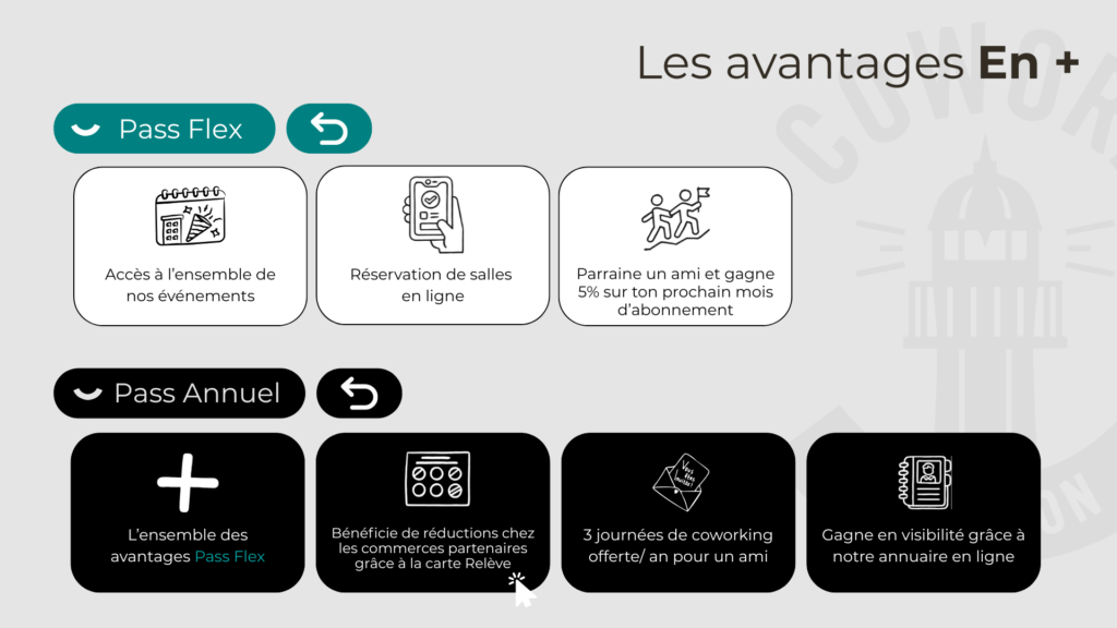 Avec les Pass Flex et Solidaire, bénéficiez d’un accès privilégié à l’ensemble de nos évènements, à notre système de réservation de salles en ligne, et d’une offre de parrainage (5% sur votre prochain abonnement).
